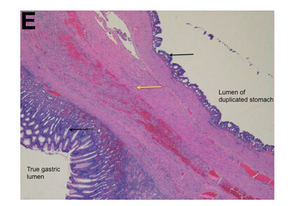 令人驚訝的是,胃大部切除標(biāo)本(圖D)檢查發(fā)現(xiàn)在疑似腫瘤的胃壁區(qū)域內(nèi)有扁平囊。這一扁平囊可以拉伸到9×8×4.5cm。胃囊與真實(shí)胃腔之間有一處共同的壁。通過此壁的組織學(xué)切片(圖E)顯示了分隔壁兩側(cè)的平滑肌細(xì)胞層和胃黏膜。這排除了GIST,證實(shí)胃重復(fù)畸形的診斷(GDC)。胃重復(fù)畸形是一種罕見的先天性異常,僅占胃腸道所有重復(fù)囊腫的4%至9%。大多數(shù)病例報(bào)告發(fā)生在兒童中且位于胃大彎處。GDC有以下3個(gè)特點(diǎn):(1)囊腫的壁與胃壁相連,(2)囊腫由平滑肌包圍,通過肌肉與胃壁相連,(3)囊壁排列有胃上皮或其它類型的胃黏膜。