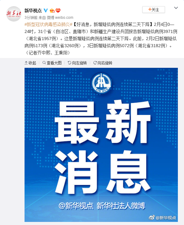 2月4日0—24時,31個?。ㄗ灾螀^(qū)、直轄市)和新疆生產(chǎn)建設(shè)兵團(tuán)報告新增疑似病例3971例(湖北省1957例)。這是新增疑似病例連續(xù)第二天下降。此前,2月2日新增疑似病例5173例(湖北省3260例),3日新增疑似病例5072例(湖北省3182例)。(記者齊中熙、王秉陽)