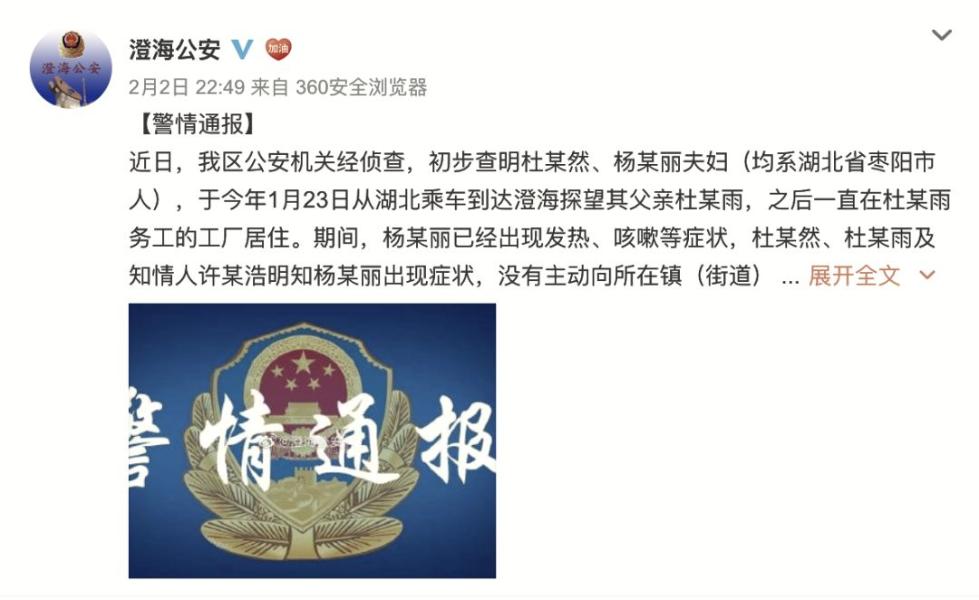 2月3日凌晨, 廣東省汕頭市公安局澄海分局發(fā)布警情通報(bào)。