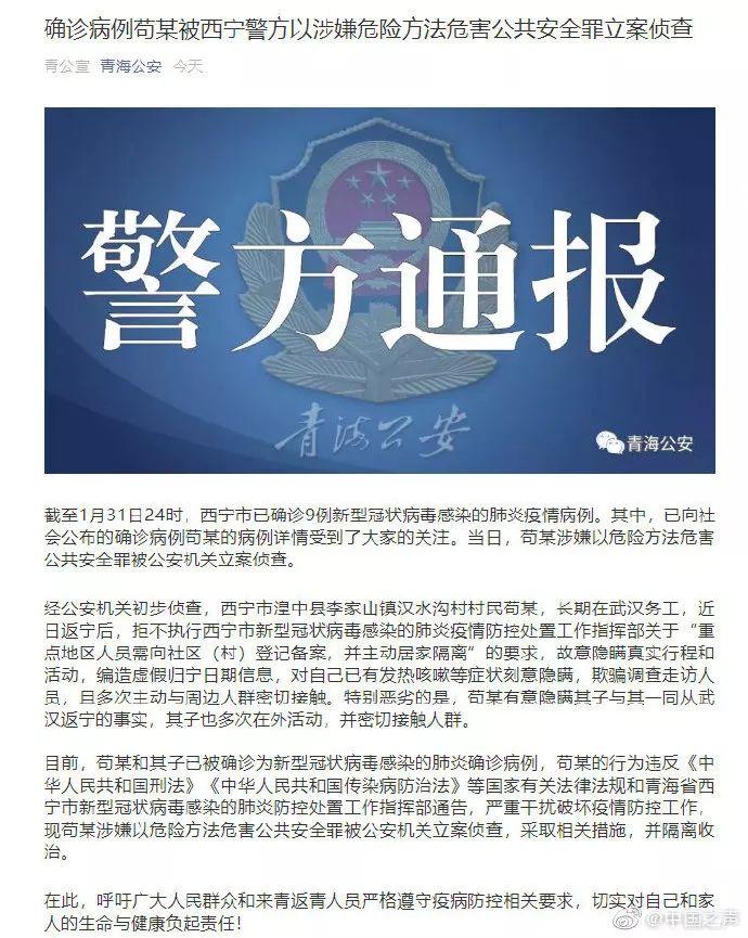 經(jīng)公安機(jī)關(guān)初步偵查,西寧市湟中縣李家山鎮(zhèn)漢水溝村村民茍某,長(zhǎng)期在武漢務(wù)工,近日返寧后,拒不執(zhí)行西寧市新型冠狀病毒感染的肺炎疫情防控處置工作指揮部關(guān)于“重點(diǎn)地區(qū)人員須向社區(qū)(村)登記備案,并主動(dòng)居家隔離”的要求,故意隱瞞真實(shí)行程和活動(dòng),編造虛假歸寧日期信息,對(duì)自己已有發(fā)熱咳嗽等癥狀刻意隱瞞,欺騙調(diào)查走訪人員,且多次主動(dòng)與周邊人群密切接觸。