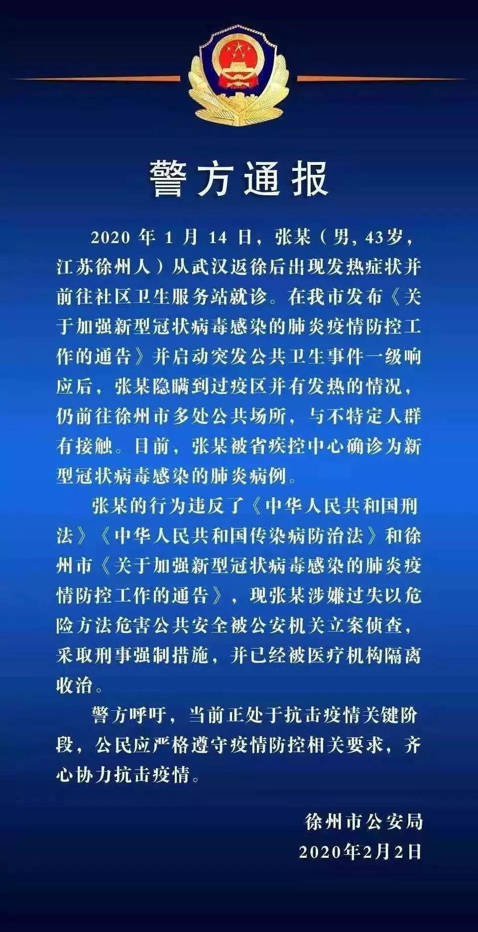 2日晚,徐州市公安局發(fā)布一則警方通報(bào),針對(duì)一名武漢返徐人員,在身體出現(xiàn)發(fā)熱癥狀后,明知徐州已發(fā)布疫情防控相關(guān)規(guī)定,在就診時(shí)故意隱瞞病情及武漢旅居史,并到多處公共場(chǎng)所與不特定人群接觸,該男子隨后被確診為新型冠狀病毒感染的肺炎病例。