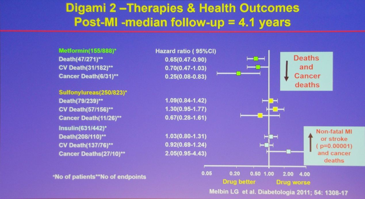 無獨(dú)有偶,二甲雙胍的這一優(yōu)勢在2011年公布結(jié)果的Digami2研究(中位隨訪時間4.1年)中也得到印證。該研究揭示,不同降糖藥物對心梗預(yù)后的影響并不相同。