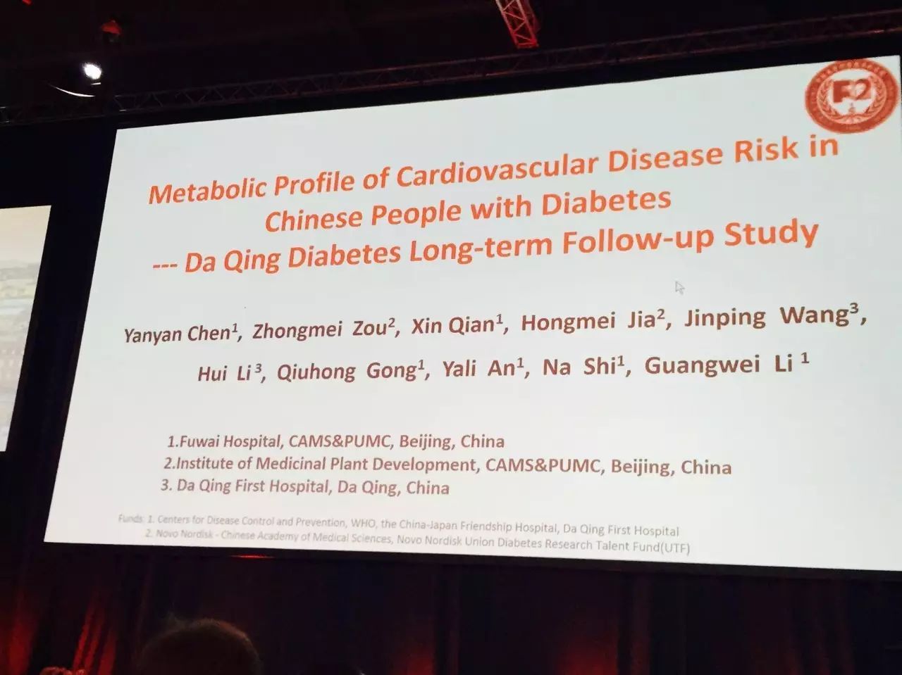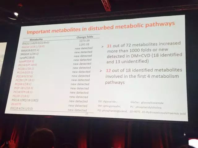 里斯本時(shí)間9月14日上午,在Fitzgerald Hall,中國(guó)醫(yī)學(xué)科學(xué)院阜外醫(yī)院陳燕燕教授代表團(tuán)隊(duì)匯報(bào)了“中國(guó)糖尿病人群心血管疾病風(fēng)險(xiǎn)代謝特征——大慶研究長(zhǎng)期隨訪結(jié)果”。通過(guò)對(duì)大慶研究人群進(jìn)行長(zhǎng)期隨訪,發(fā)現(xiàn)72種代謝產(chǎn)物及8種代謝途徑與糖尿病心血管疾病相關(guān),其中18種代謝產(chǎn)物在糖尿病合并心血管疾病人群中升高超過(guò)1000倍。多變量回歸分析顯示2種代謝物(20-HETE、Palmitoyl sphingomyelin)可能是糖尿病合并心血管疾病的獨(dú)立危險(xiǎn)因素;其中4種代謝途徑與糖尿病心血管疾病高度相關(guān)。